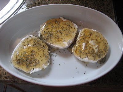 Coloquei as fatias do queijo num pirex, reguei com mel e polvilhei com orégãos.