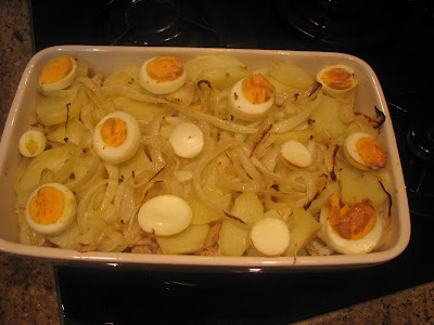 Coloque num pirex, uma camada de batatas, de bacalhau, e de cebolada, repita as camadas até terminar com uma camada de cebolada.